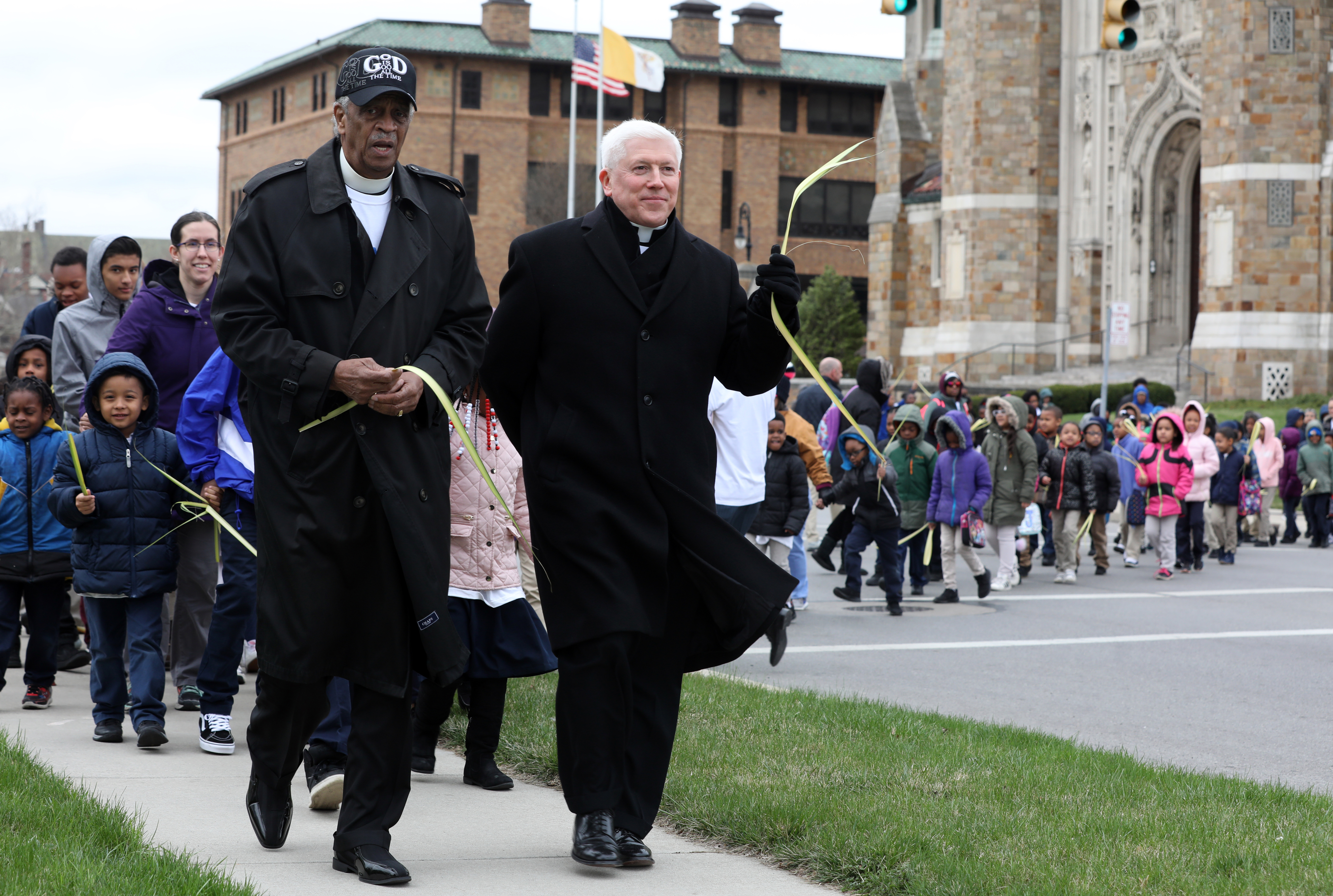 Bishop Robert Culp, left, and Bishop Daniel Thomas, walk in the procession from Rosary Cathedral to the First Church of God during the second annual, pre-Palm Sunday Celebration with students from Rosary Cathedral Catholic School on Thursday, April 11, 2019. THE BLADE/AMY E. VOIGT