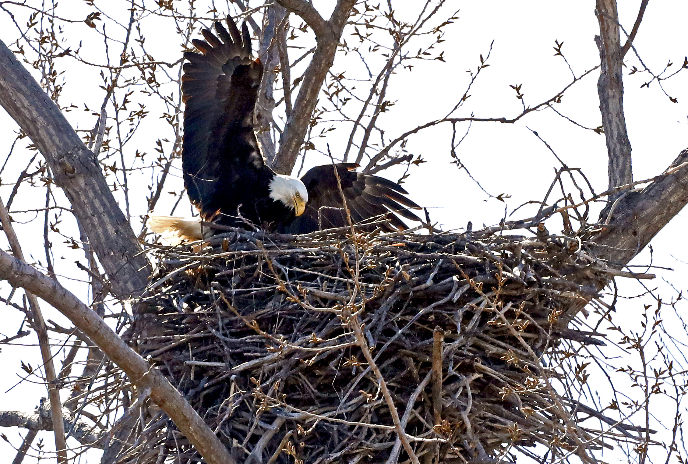 A bald eagle returns to its nest at the Magee Marsh Wildlife Area in Oak Harbor, Ohio, on Tuesday, April 9, 2019. THE BLADE/KURT STEISS CTY eaglerover09p