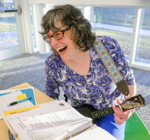Sheila Painter plays her ukulele during Toledo Ukesters Meetup Tuesday, April 9, 2019, at the King Road Library in Toledo, Ohio. THE BLADE/JEREMY WADSWORTH