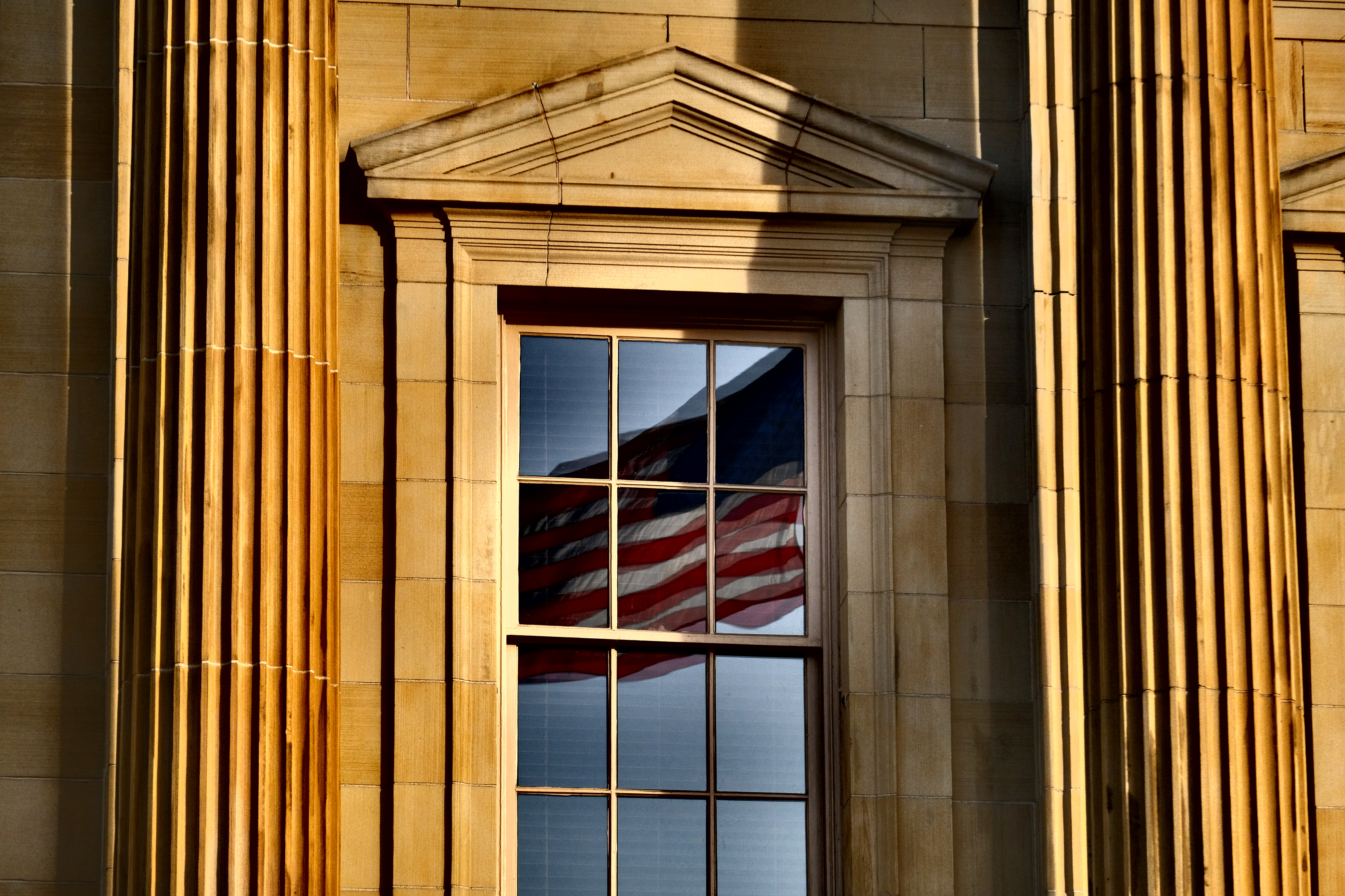 The American Flag is reflected in the window of the Federal Courthouse Wednesday, March 27, 2019, in Toledo, Ohio. THE BLADE/JEREMY WADSWORTH