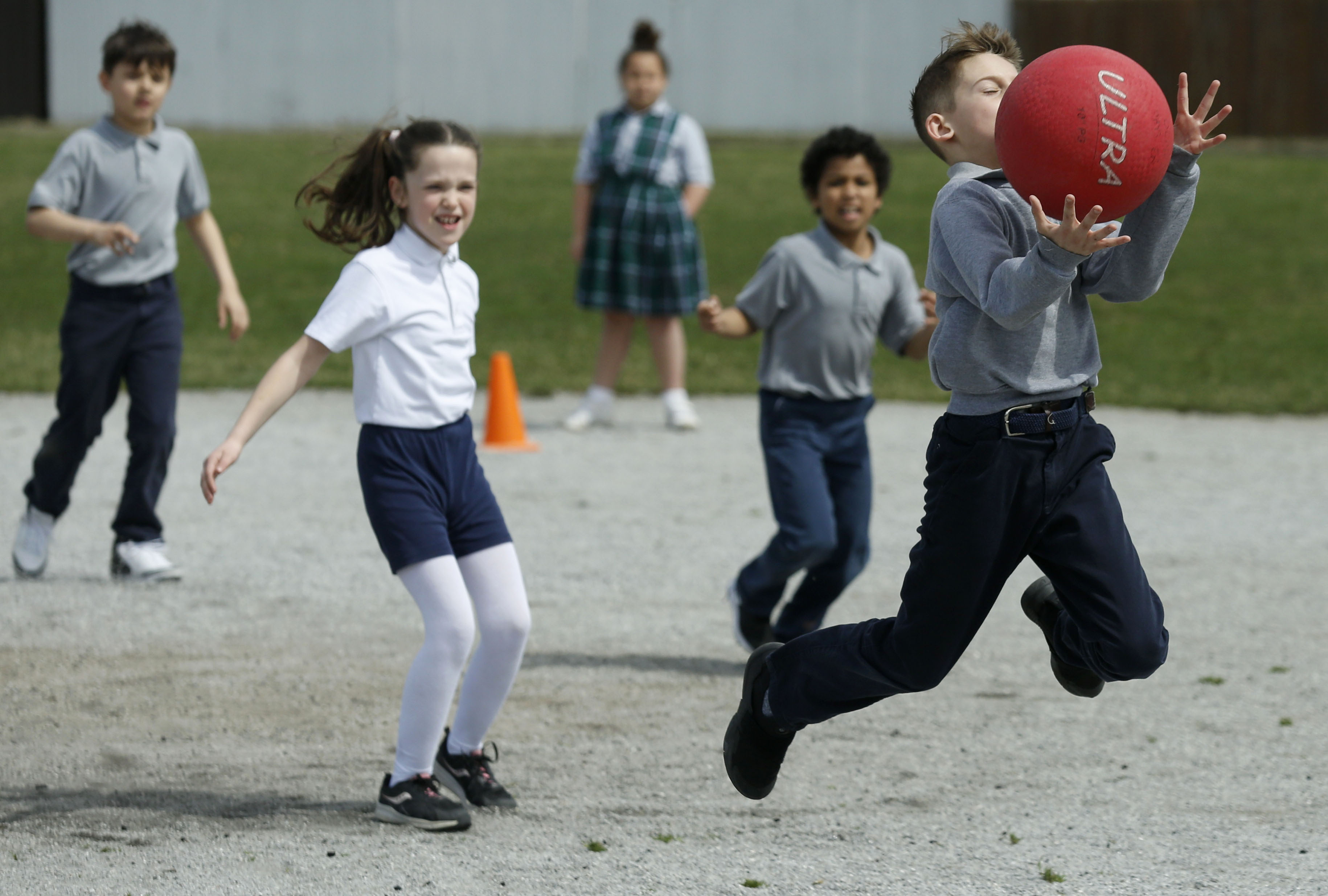 Our Lady of Perpetual Help third grader Geprii Rooker leaps to make a catch while playing kickball during gym class on Monday, April 8, 2019. This is the first time this class has been outside due to the cold and wet weather.THE BLADE/LORI KING