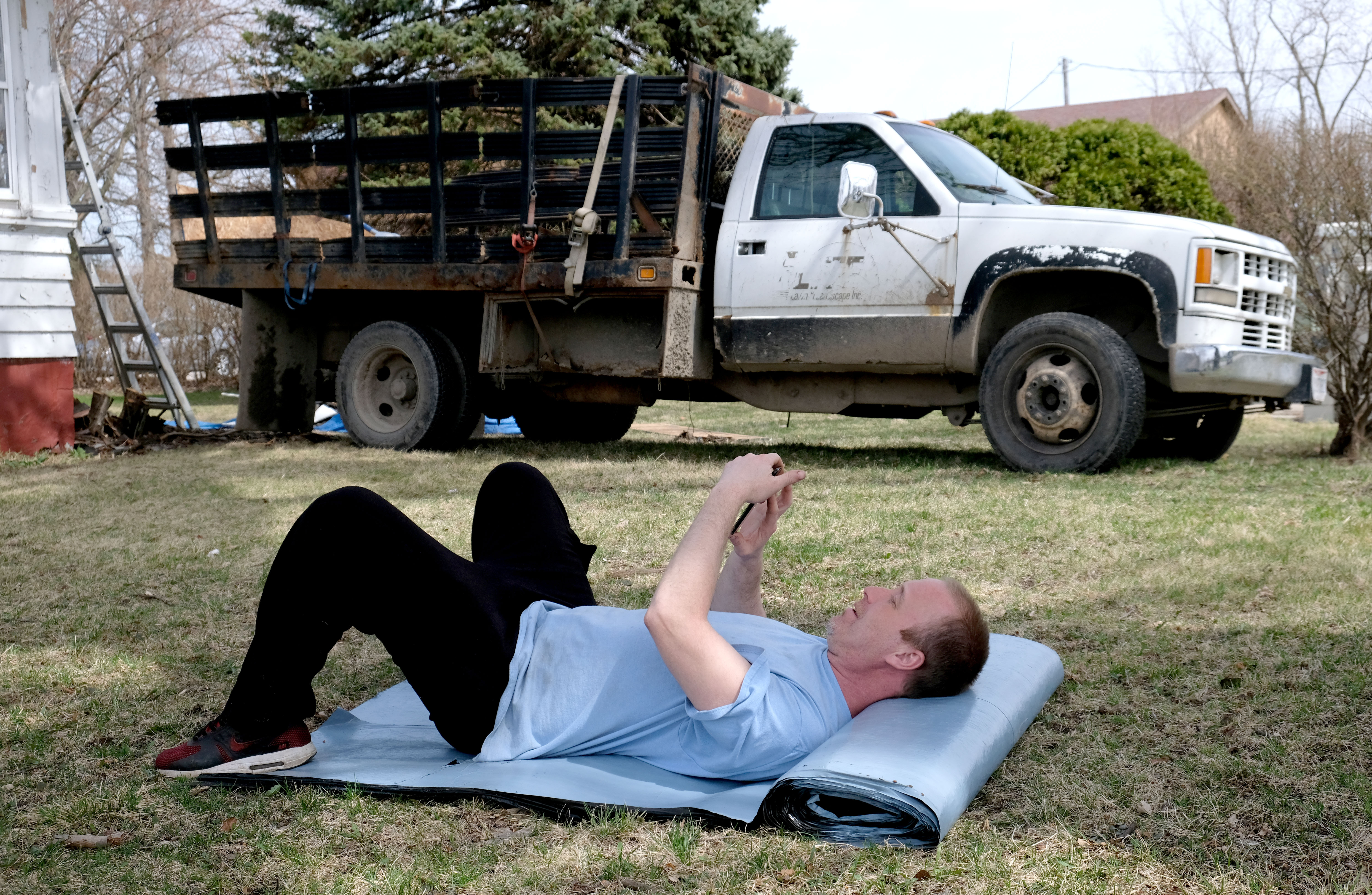 Fry’s Roofing and Construction worker Larry Murphy takes a lunch break on the lawn of a home on Monday, April 8, 2019. Murphy and his coworkers were working on a roof at the home on Carney Dr. in Maumee, Ohio. THE BLADE/LORI KING ROV warmweather08