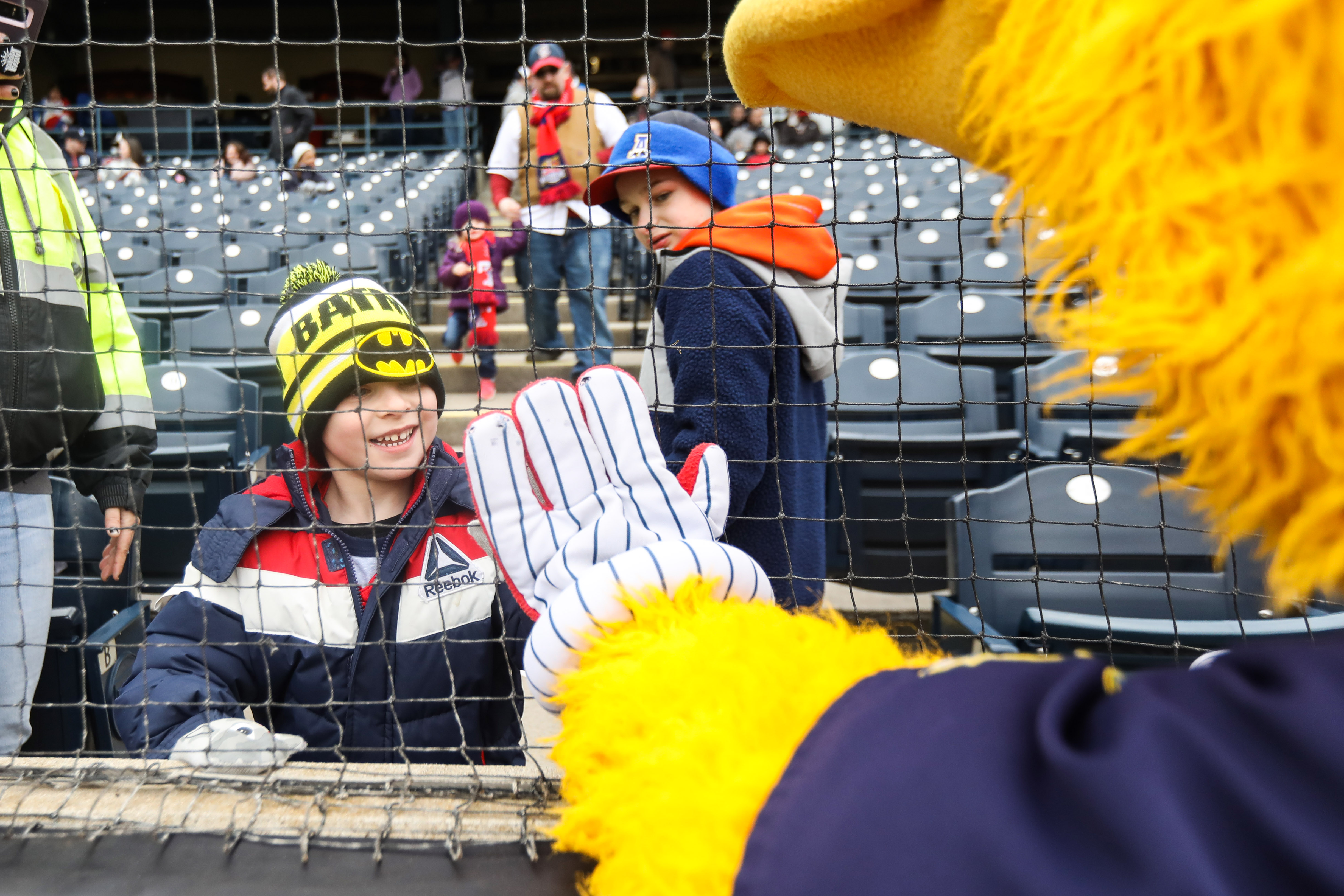 Peter Smith gives a high five during Opening Day for the Toledo Mud Hens at Fifth Third Field in downtown Toledo, Ohio on Thursday April 4, 2019. THE BLADE/REBECCA BENSON