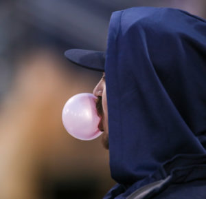 Toledo Mud Hens pitcher Tyler Alexander blows a bubble in the dugout during a baseball game against the Indianapolis Indians Wednesday, April 10, 2019, at Fifth Third Field in Toledo, Ohio. THE BLADE/JEREMY WADSWORTH SPT Hens11