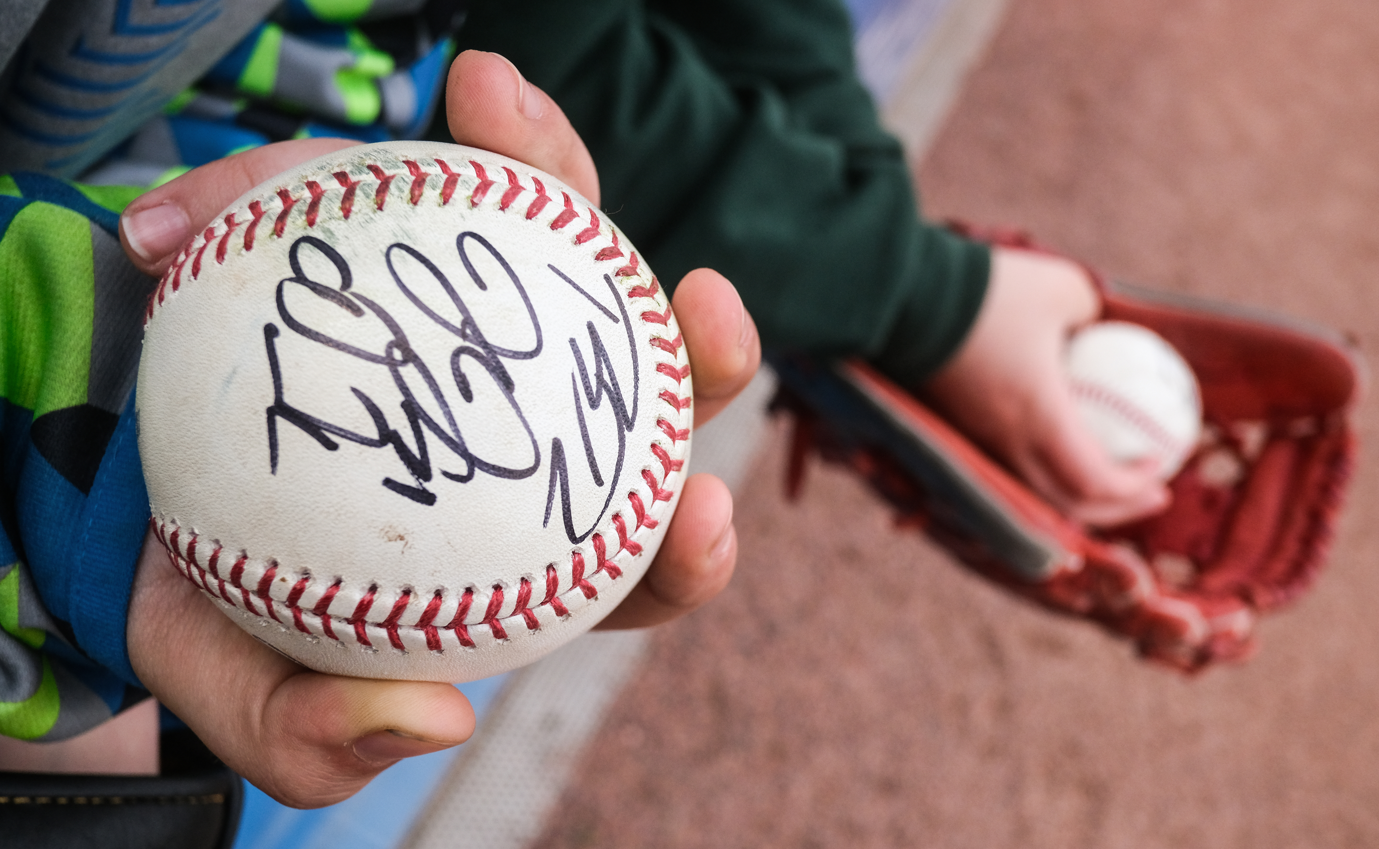 Jacob LaLonde, 9, of Oak Harbor, Ohio, tries to get autographs from Toledo Mud Hens baseball players Wednesday, April 10, 2019, at Fifth Third Field in Toledo, Ohio. THE BLADE/JEREMY WADSWORTH SPT Hens11