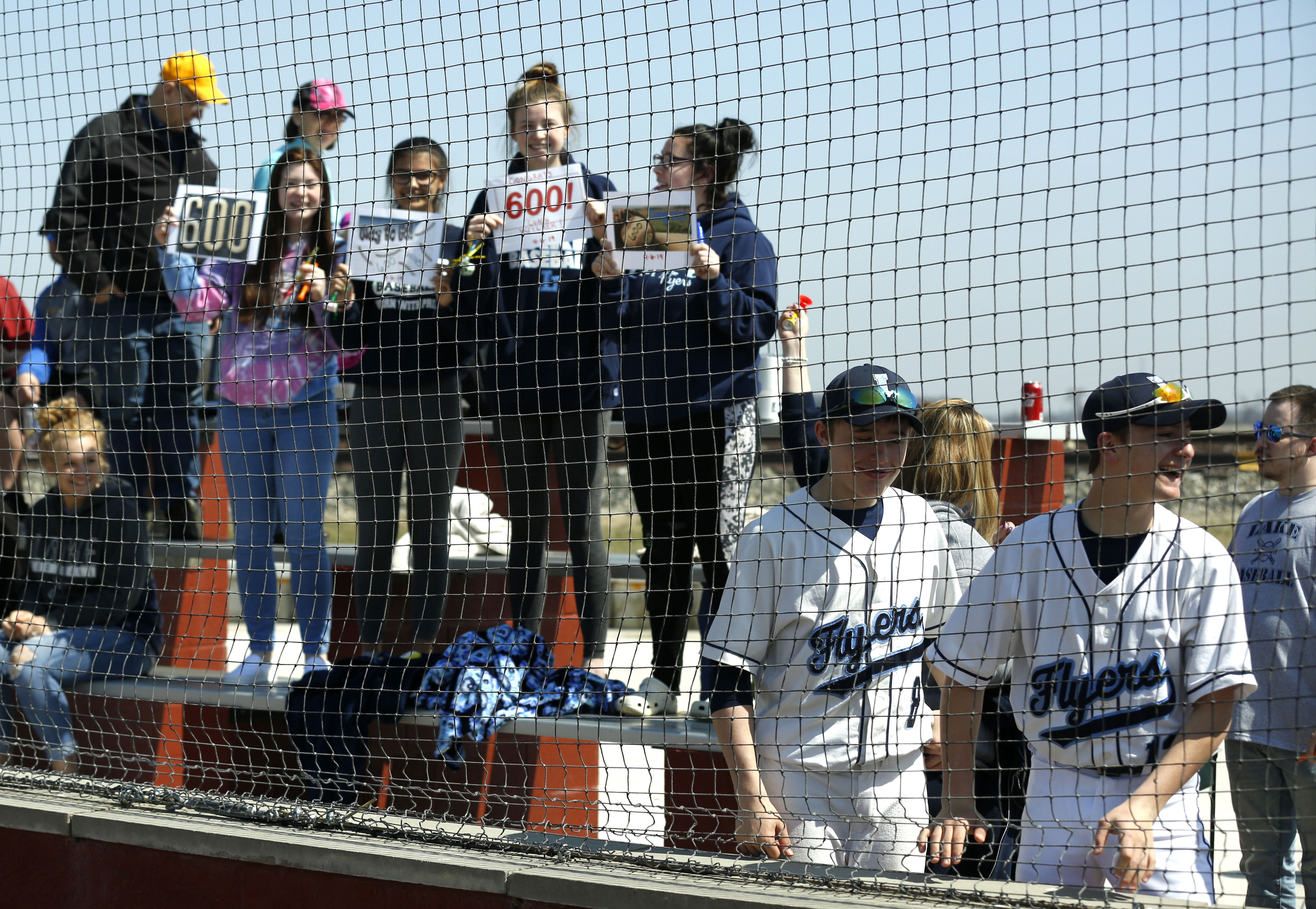 Lake High School fans celebrate head baseball coach Greg Wilker’s 600th win during a home game against Wauseon on Saturday, April 6, 2019. THE BLADE/LORI KING