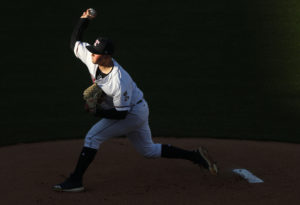 Toledo starting pitcher Kyle Funkhouser throws against Indianapolis during an International League baseball game at Fifth Third Field in Toledo. THE BLADE/LORI KING SPT hens10