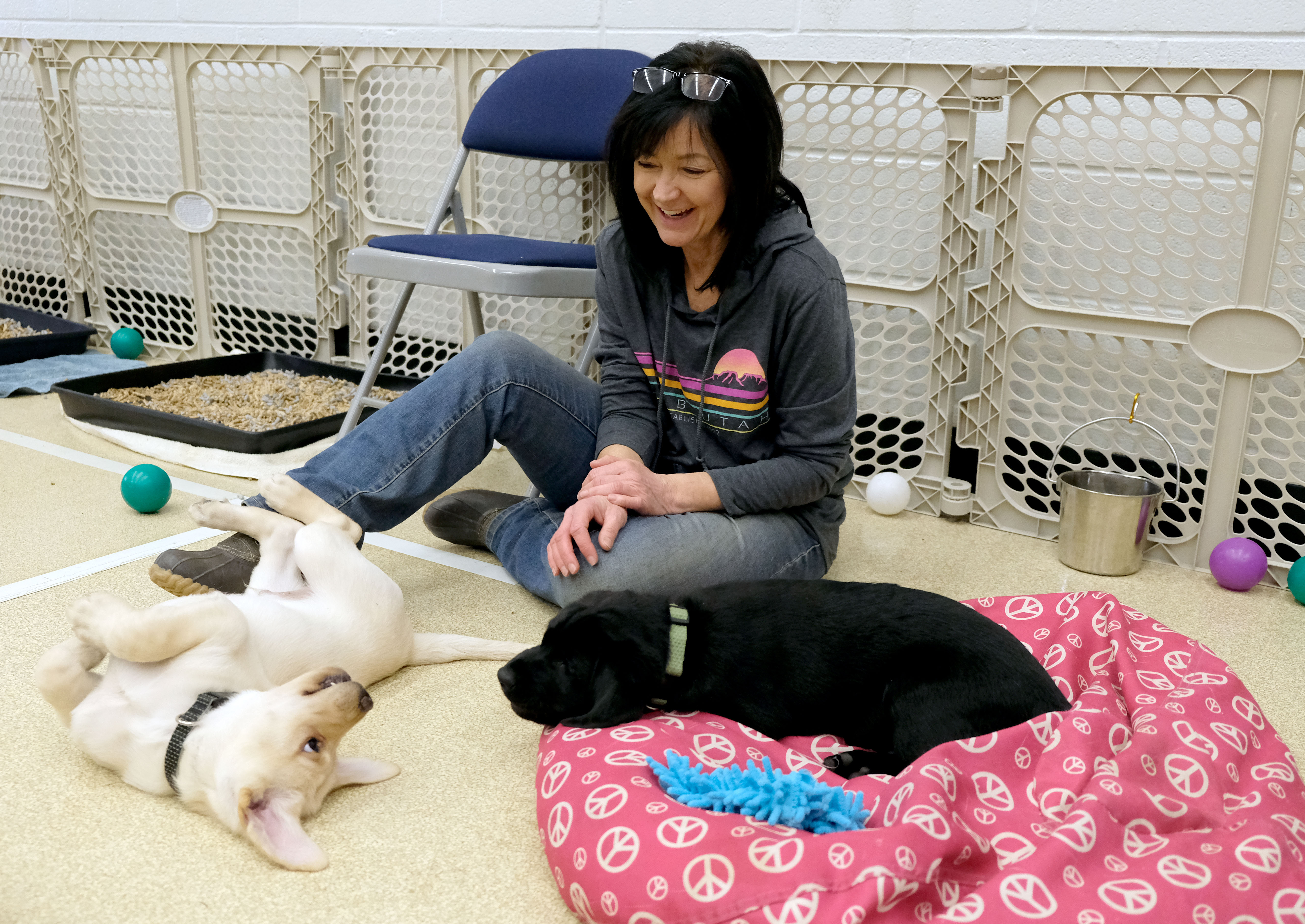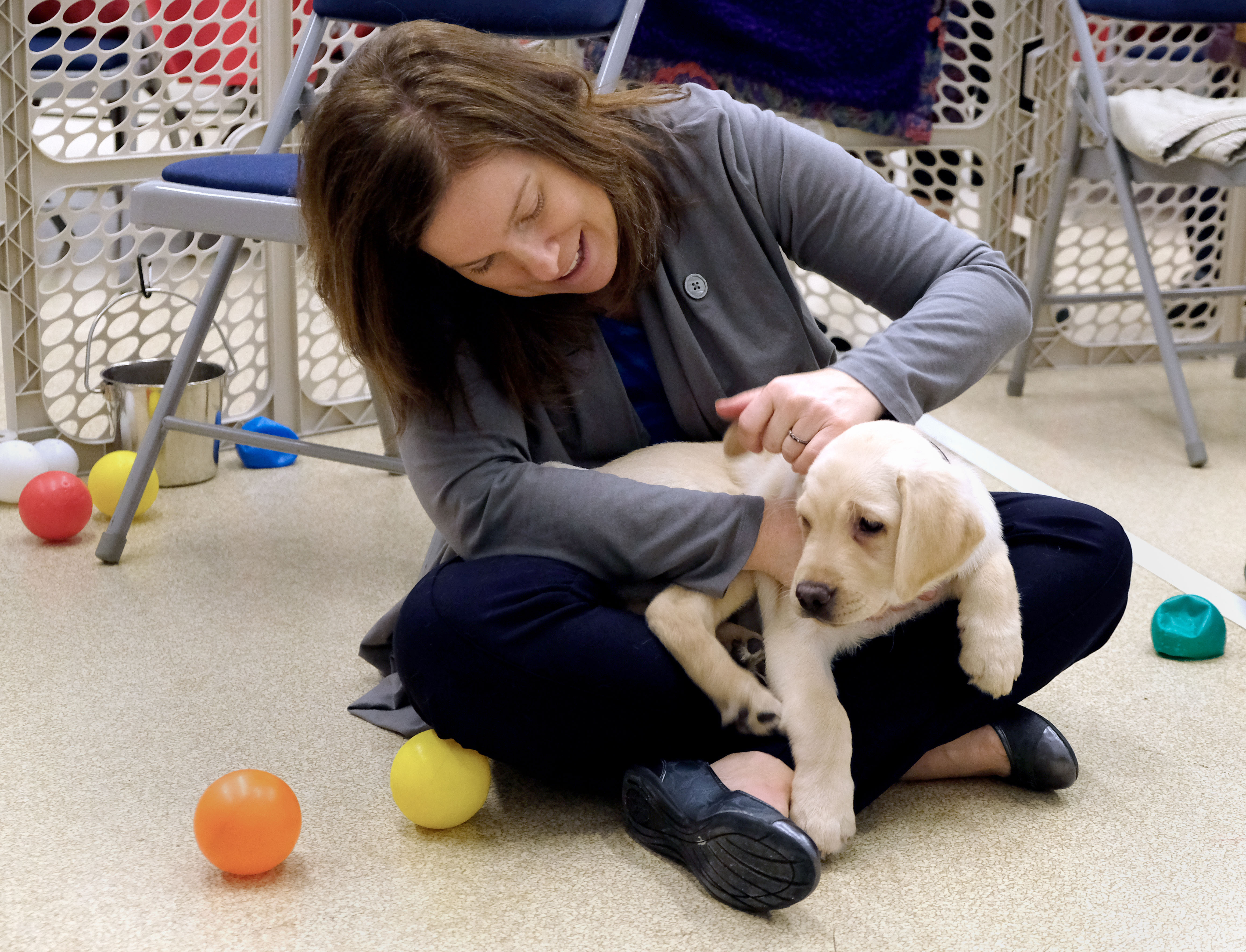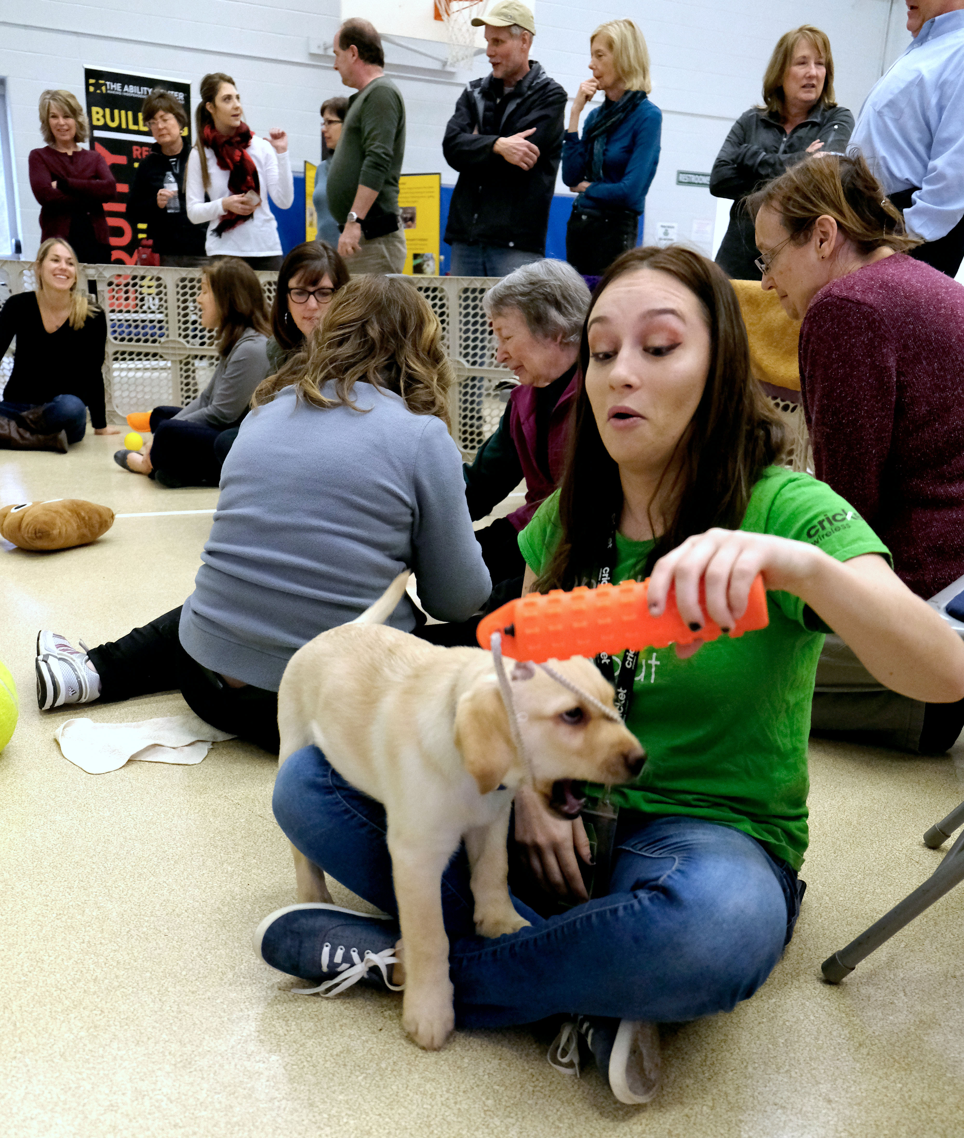 - Robin Wegman, with the ADAI puppy smart start program, plays with a Labrador Retriever puppy during a Special Auxiliary Play Date for invited guests at the Ability Center in Sylvania. THE BLADE/LORI KING