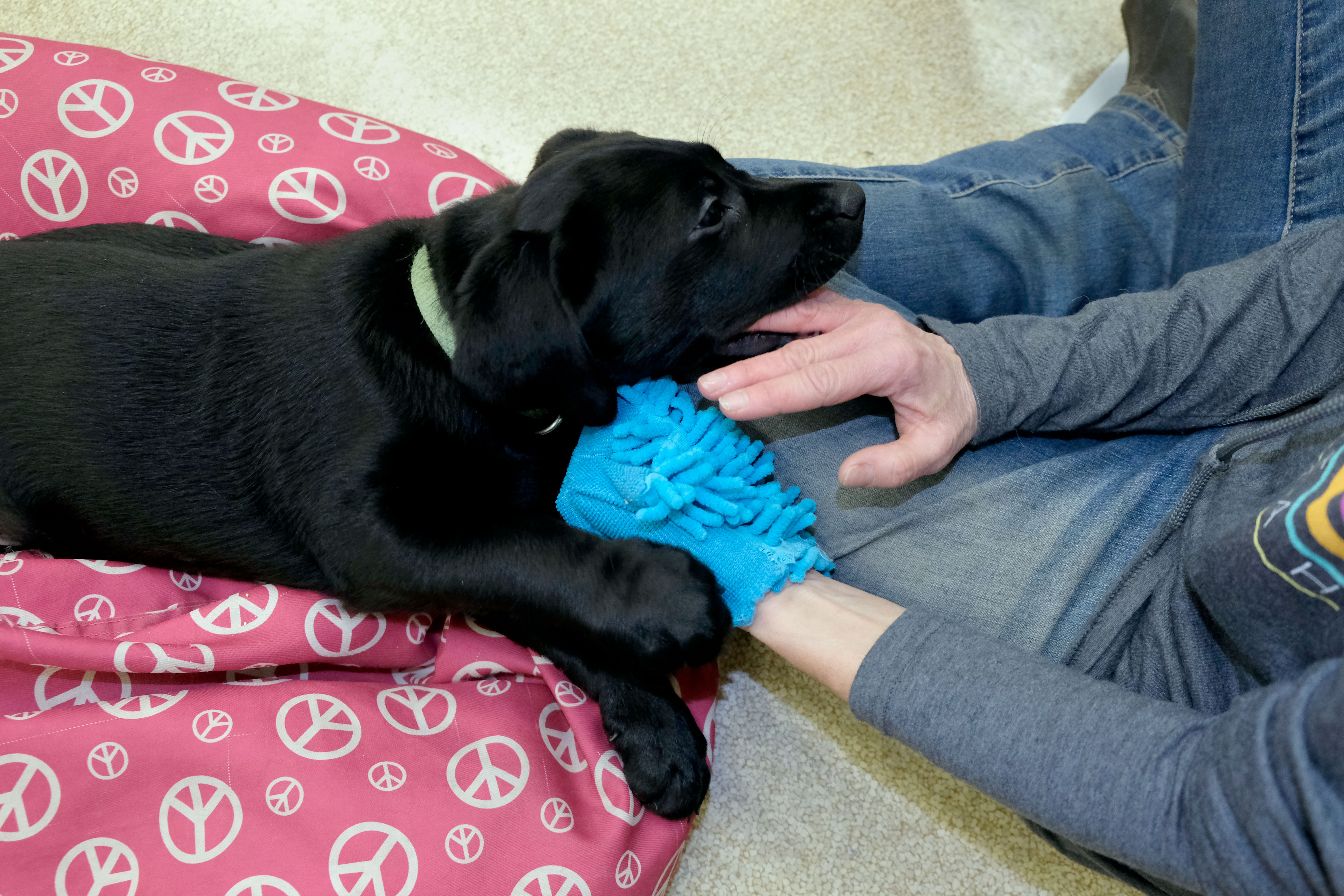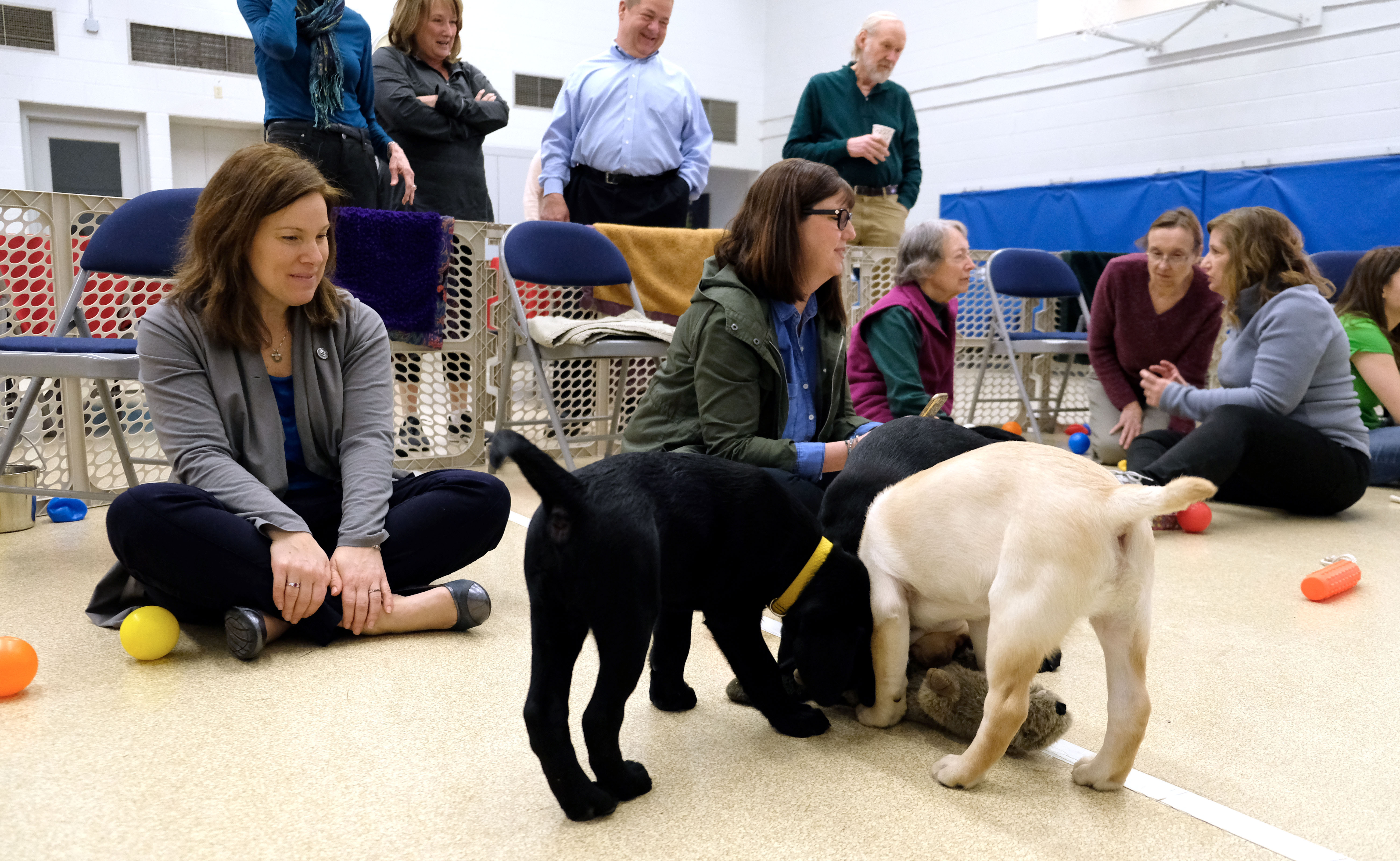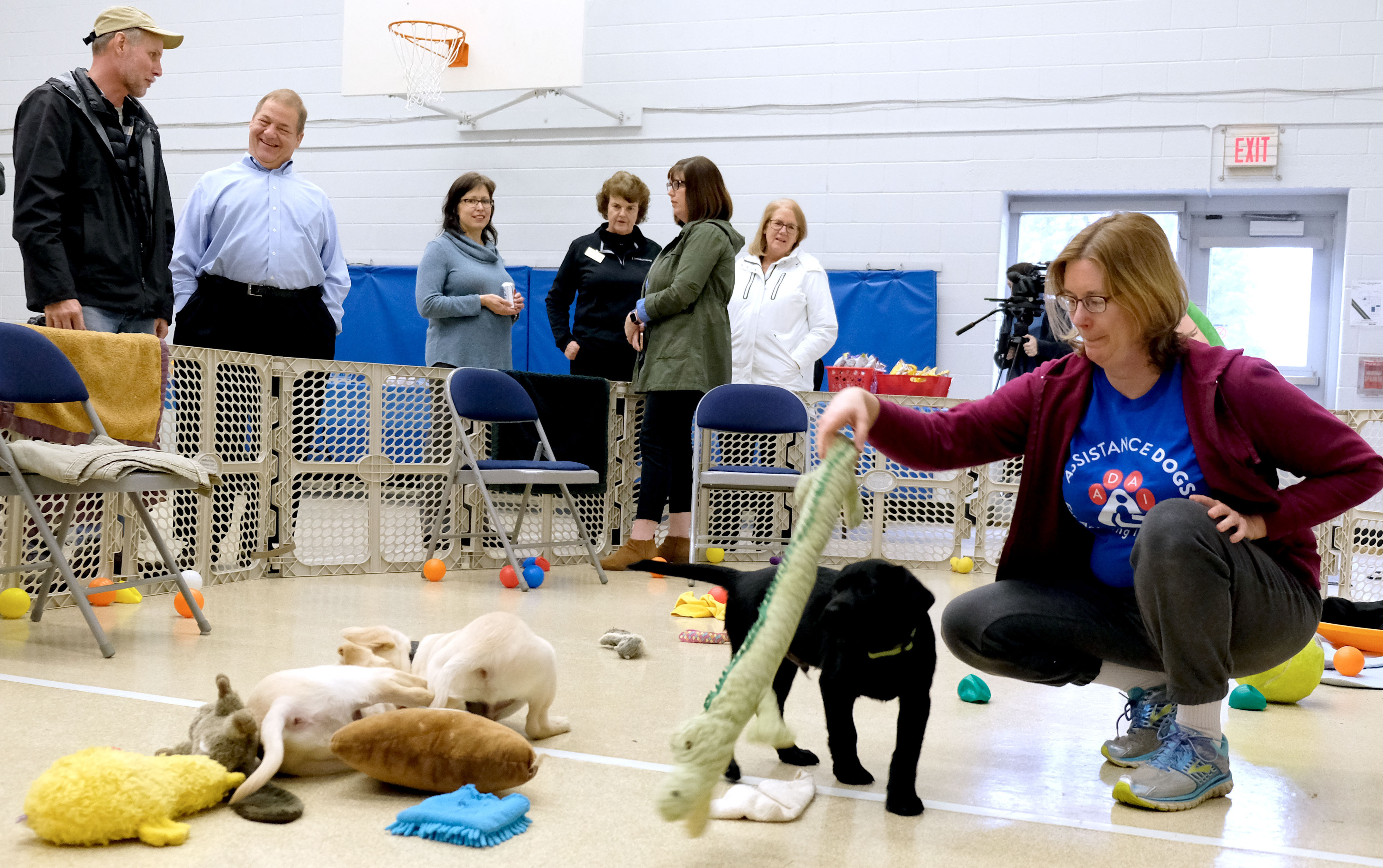 - Robin Wegman, with the ADAI puppy smart start program, plays with a Labrador Retriever puppy during a Special Auxiliary Play Date for invited guests at the Ability Center in Sylvania. THE BLADE/LORI KING