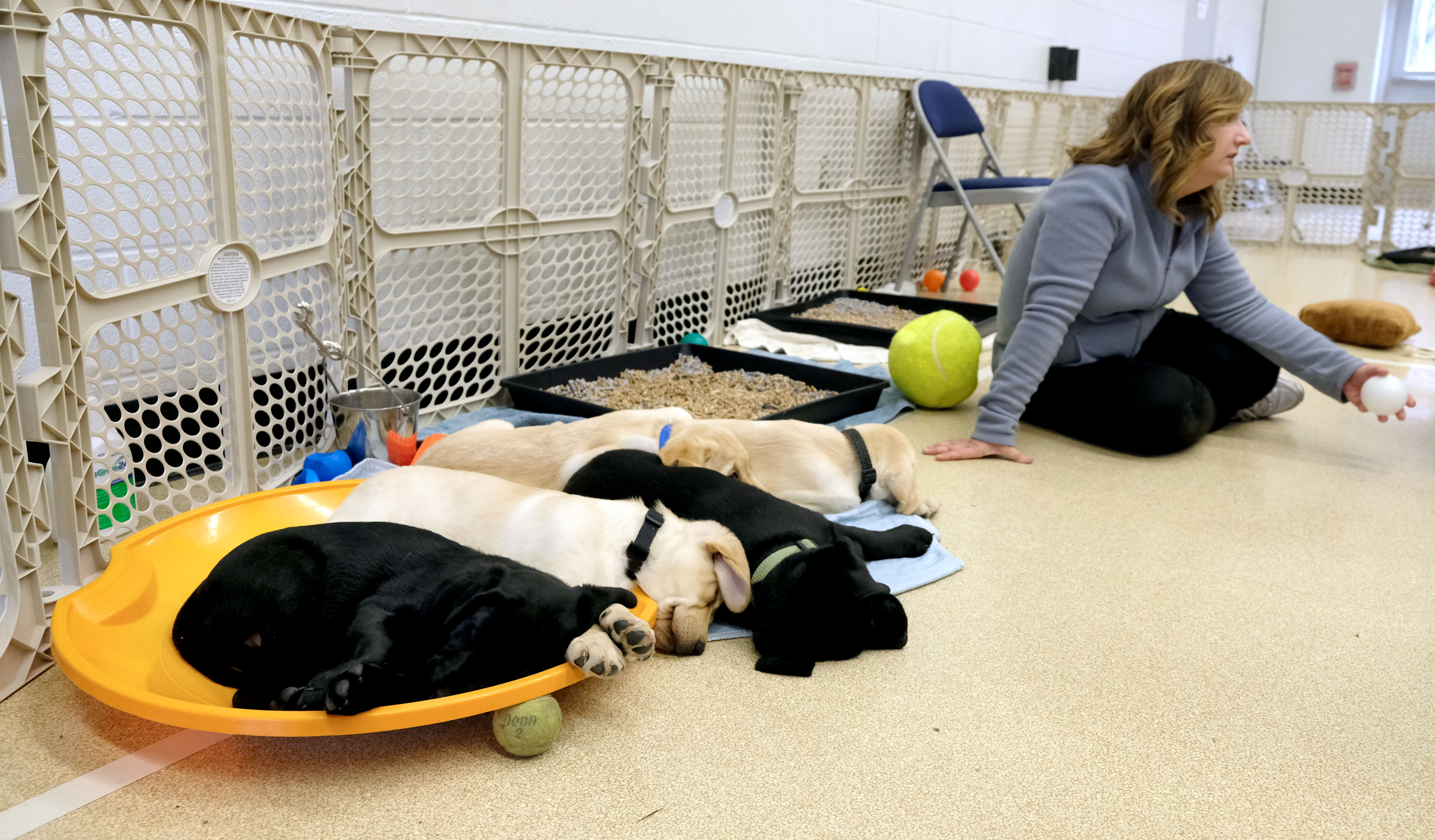 - After several hours of playing with volunteers, Labrador Retriever puppies nap while Diane Dunn sits close by during a Special Auxiliary Play Date for invited guests at the Ability Center in Sylvania. THE BLADE/LORI KING