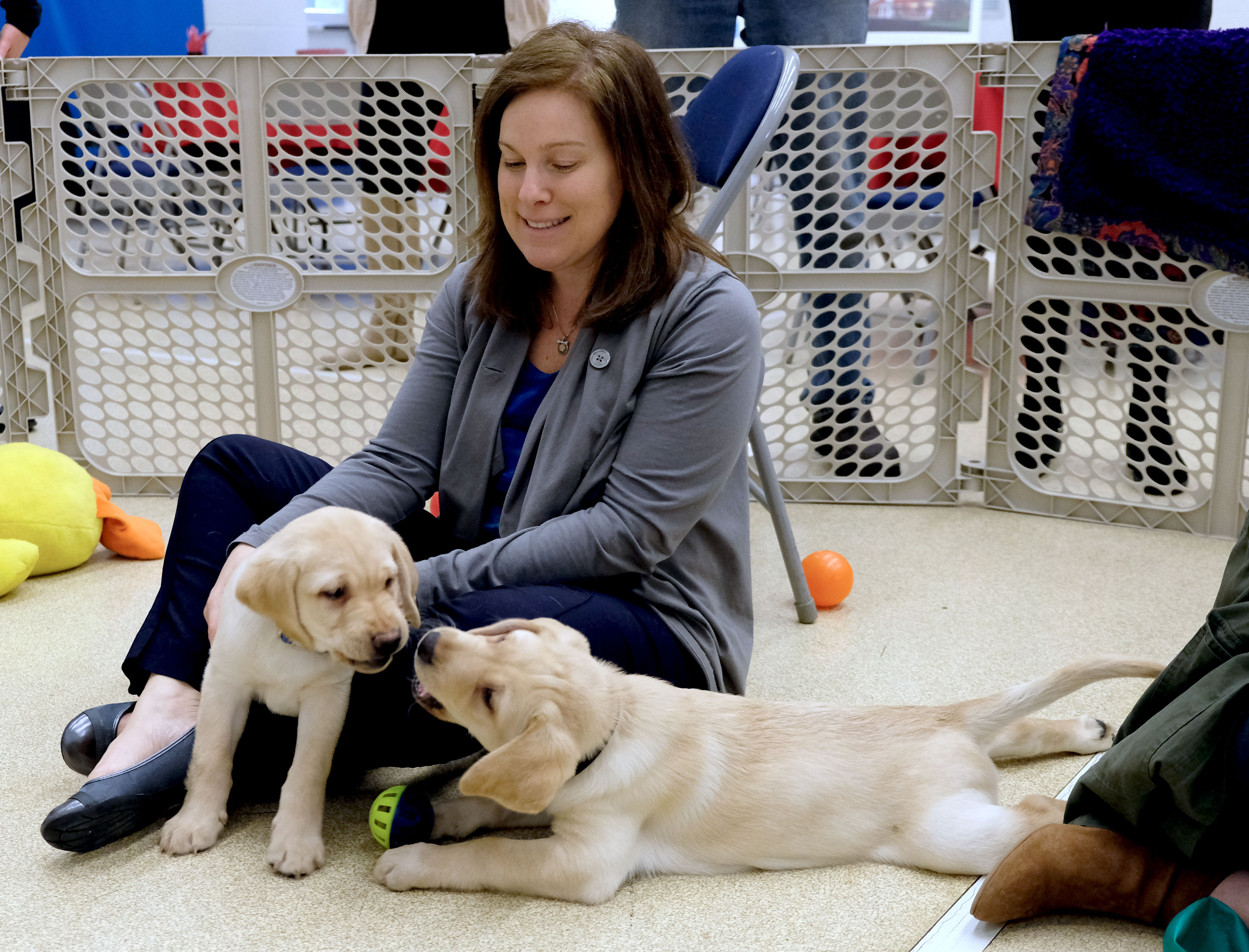 - Supplemental Staffing puppy sponsor Cristie McKenzie pets a Labrador Retriever puppy during a Special Auxiliary Play Date for invited guests at the Ability Center in Sylvania. THE BLADE/LORI KING
