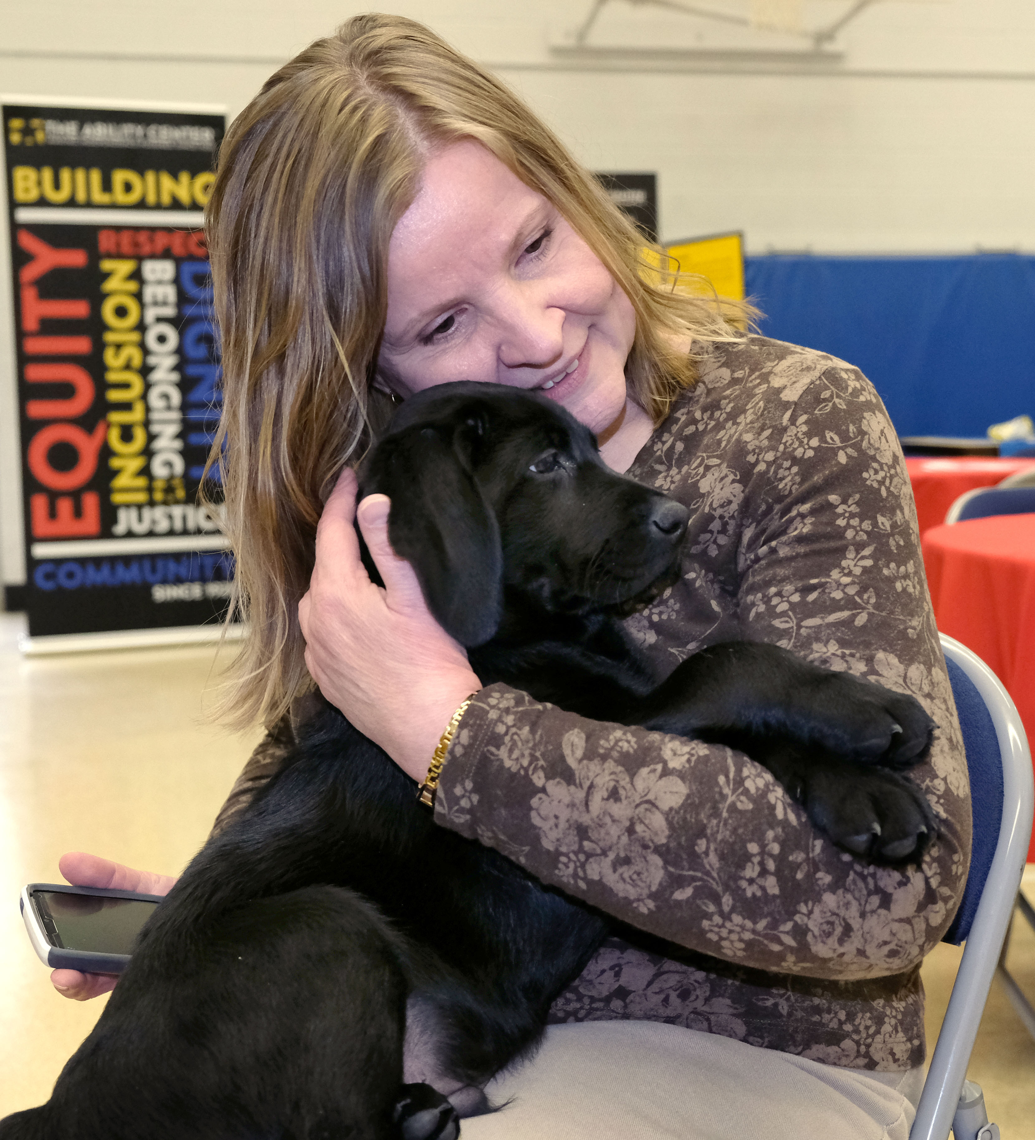 - ADAI employee Kristina Irvin hugs a Labrador Retriever puppy during a Special Auxiliary Play Date for invited guests at the Ability Center in Sylvania. THE BLADE/LORI KING
